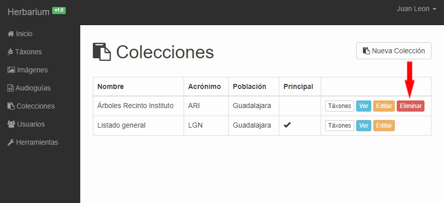 - En Herbarium como mínimo habrá una colección que agrupa todos los táxones introducidos por los usuarios pertenecientes a la entidad. Esta colección está marcada como Principal.