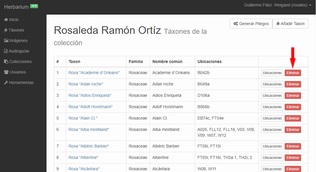 {{PASO|NumPaso=1|Imagen=https://galeria2.nomenplantor.org/galleries/herbarium/botanipedia/colecciones/Listado_taxones_coleccion_eliminar.jpg|ImagenReducida=https://galeria2.nomenplantor.org/_data/i/galleries/herbarium/botanipedia/colecciones/Listado_taxones_coleccion_eliminar-sm.jpg|Texto=Si queremos eliminar uno de los táxones de la colección, bastará con hacer clic sobre el botón ['''Eliminar'''] del taxon correspondiente. Eliminar un taxon de una colección sólo significa que no estará en la colección pero no lo eliminamos de nuestra lista de táxones. | |||