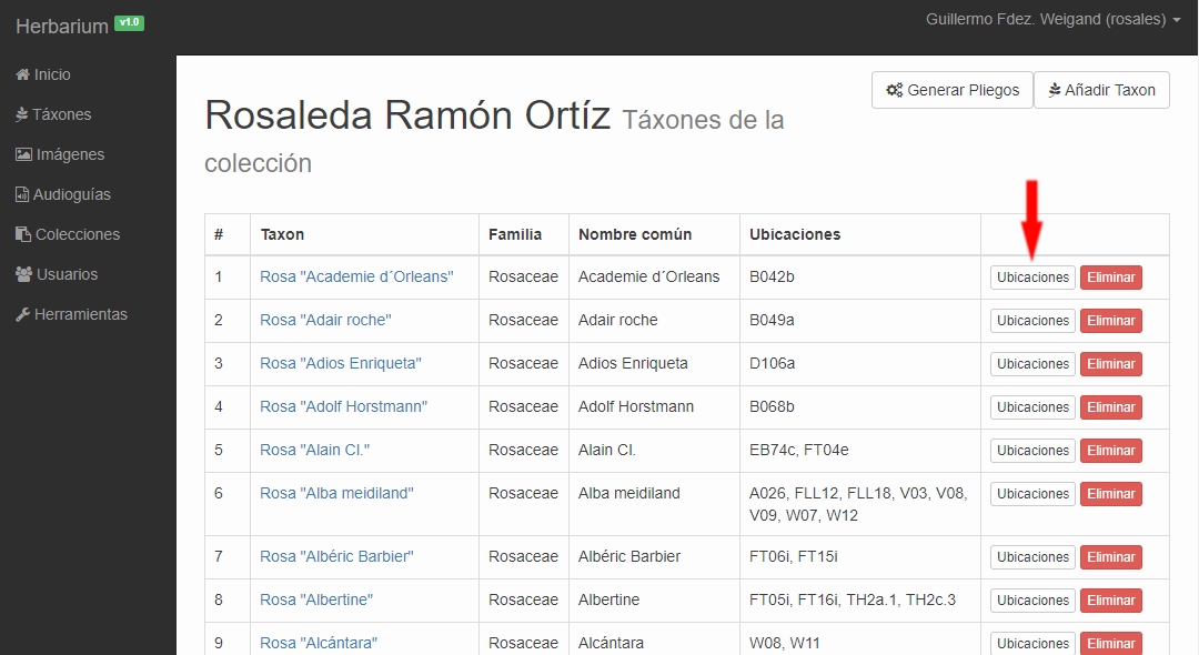 {{PASO|NumPaso=4|Imagen=https://galeria2.nomenplantor.org/galleries/herbarium/botanipedia/colecciones/Listado_taxones_coleccion_ubicaciones.jpg|ImagenReducida=https://galeria2.nomenplantor.org/_data/i/galleries/herbarium/botanipedia/colecciones/Listado_taxones_coleccion_ubicaciones-sm.jpg|Texto=Como podemos observar, con cada taxon disponemos el botón ['''Ubicaciones'''] que nos permite gestionar las ubicaciones del taxon dentro de las georreferencias que hayamos importado para la colección. | |||