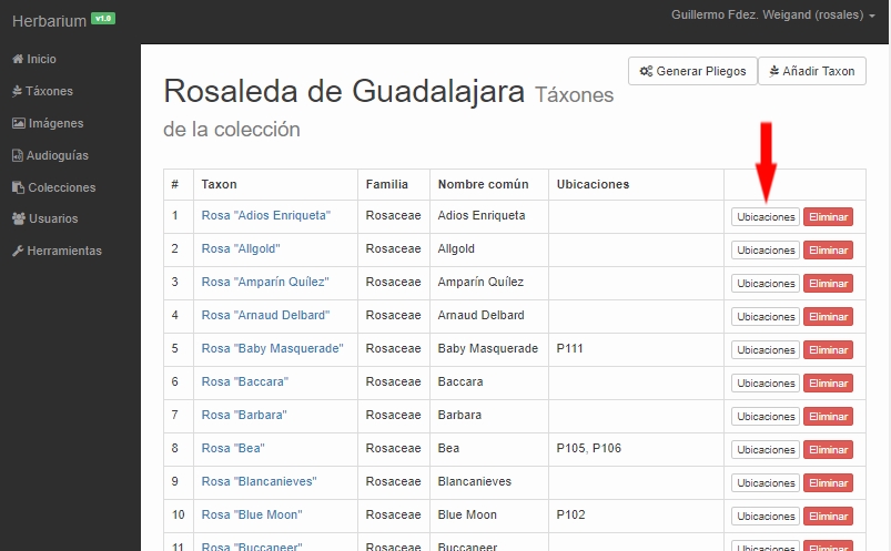 Hacemos clic en el botón [Ubicaciones] del taxon de la colección que queremos georreferenciar. Listado_taxones_ubicaciones-sm.jpg
